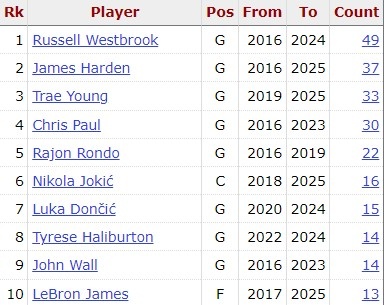 據(jù)統(tǒng)計(jì),這是威少過(guò)去10個(gè)賽季以來(lái),第50次半場(chǎng)助攻上雙,為同期最多,哈登以37次排第二。