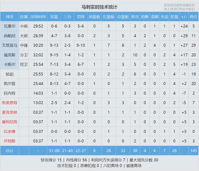 馬刺最多領先到27分,盡管火箭追回一些分數(shù),但分差依然在15+!三節(jié)打完,馬刺110-94領先火箭16分。第四節(jié)火箭一度縮小到12分,凱爾登和文班連砍5分,比賽很快進入垃圾時間。全場結束,馬刺145-120大勝火箭25分。