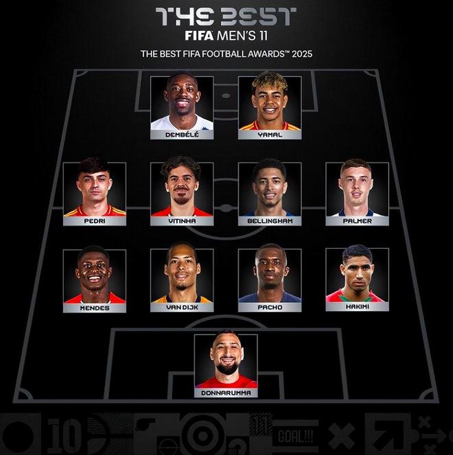 此外,2025FIFA年度最佳陣容也隨之出爐,多納魯馬(巴黎/曼城)、阿什拉夫(巴黎)、帕喬(巴黎)、范戴克(利物浦)、門德斯(巴黎)、帕爾默(切爾西)、貝林厄姆(皇馬)、維蒂尼亞(巴黎)、佩德里(巴薩)、亞馬爾(巴薩)、登貝萊(巴黎)入圍。